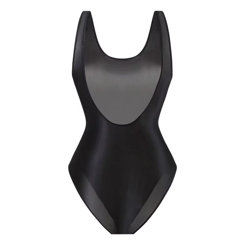 Sleek, simple, and ultra-flattering. This one-piece comes in a glossy finish that catches the light and smooths over your curves. A clean scoop neckline in front and a deep scoop back keep it minimal yet sexy, while the high-cut leg subtly lengthens your silhouette. Soft, stretchy fabric hugs without squeezing, so you can swim, lounge, or layer it as a bodysuit with jeans.